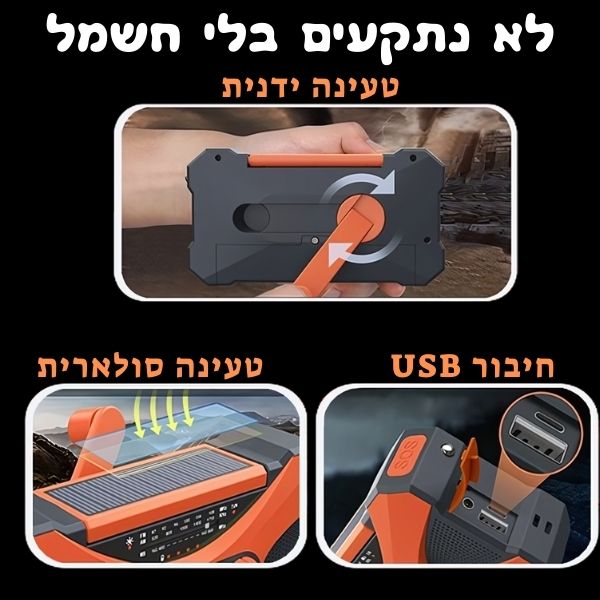 ובמידה ואין גישה לחשמל או לאור השמש תוכלו לייצר חשמל באופן עצמאי על ידי סיבוב ידית הכוח שמבטיחה שלעולם ללא תתקעו ללא חשמל!
